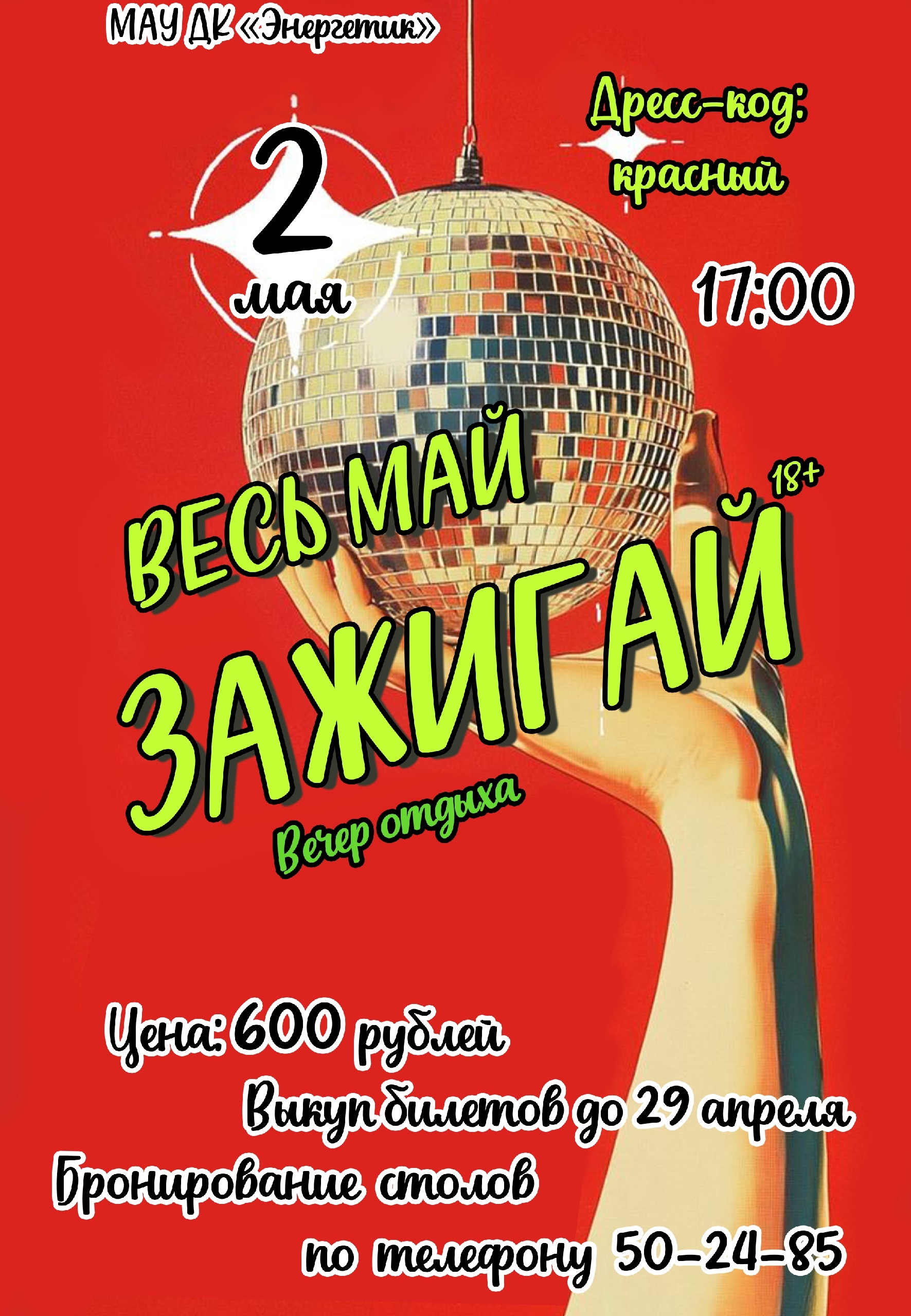 2 мая приглашаем вас на вечер отдыха «Весь май зажигай»! Провожаем сезон красиво, громко и с огоньком.